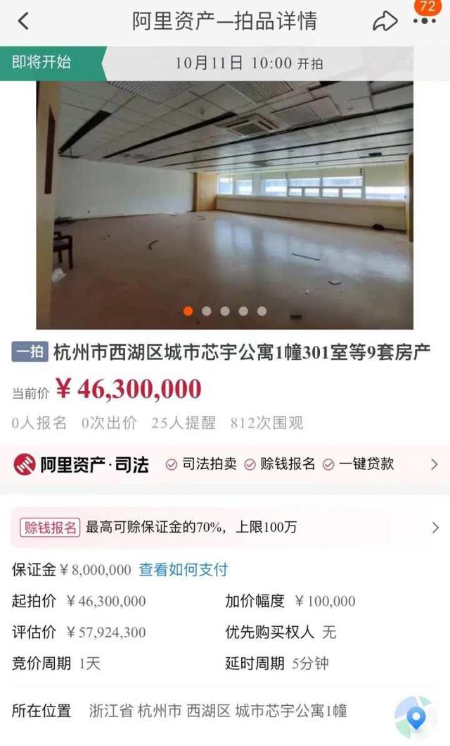 2022年9月15日消息:最近,阿里资产司法拍卖频道新上架了一批商业法拍房,其中最引人注目的是其中2个打包标的——一个是杭州市西湖区城市芯宇公寓1幢102室等87套房产,评估价价约2.688亿元,起拍价2.15亿元;另一个是城市芯宇公寓1幢301室等9套房产,评估价约5792万元,起拍价4630万元。也就是说,城市芯宇公寓总共有96套房产即将被司法拍卖。