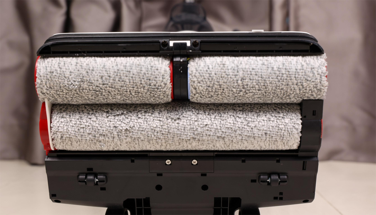 此外,石头A10 Plus还在双滚刷的基础上增加了一个“卷”的动作,前后滚刷紧密结合,依靠对向旋转时形成的内旋将垃圾和水渍卷入滚刷上方。配合高扭矩马达的搭载,为擦地过程中为滚刷持续提供强大的清洁动力。