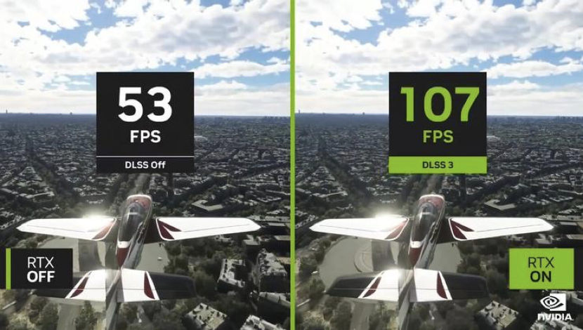 在现场,黄仁勋展示了对CPU要求比较高的《微软模拟飞行》游戏在开启DLSS 3前后的帧率变化。 图片来源:GTC大会