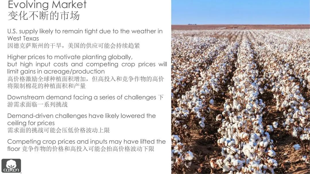 通货膨胀和利率上升将使需求放缓,这将带来的一个积极影响是物流业可能得以恢复。物流问题的解决可以缓解价格的上行压力。“随着棉花市场和宏观经济条件的不断演变,不确定性仍然是市场的主基调。”傅培花强调道。