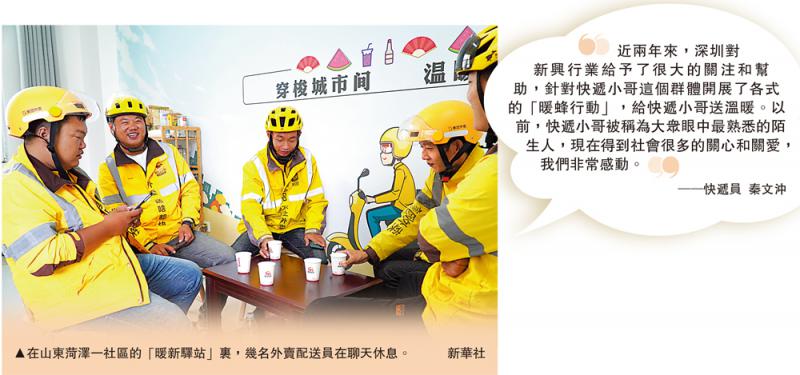 图:在山东菏泽一社区的“暖新驿站”里,几名外卖配送员在聊天休息。\新华社