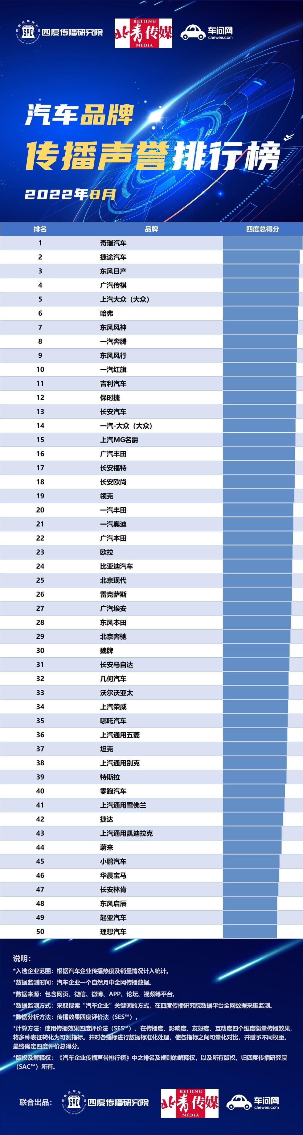 9月21日,四度传播研究院(SAC)联合北青传媒、车问网,正式发布了2022年8月份共30家汽车企业和50款汽车品牌的传播声誉排行榜。与7月不同,8月份汽车品牌的总声量要超过汽车厂商的总声量,这跟8月举办的成都国际车展有很大关系,各大车企公关部显然都把子弹放在了各自的品牌宣传上。