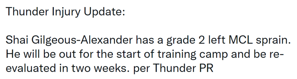 雷霆再次受到伤病打击!雷霆核心副韧带二级扭伤 预计缺席训练营初期